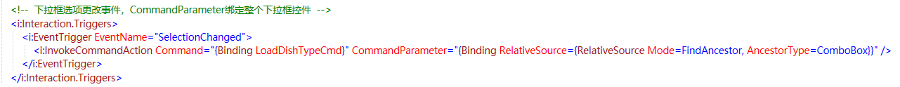 <!-- 下拉框选项更改事件,CommandParameter绑定整个下拉框控件 -->