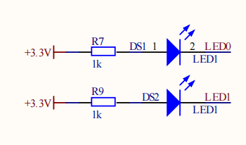 首先查看改开发板的原理图,找到LED部分: