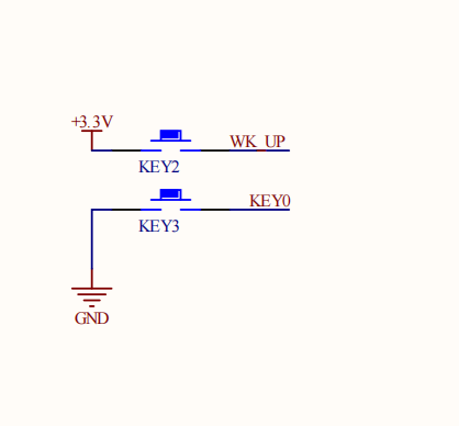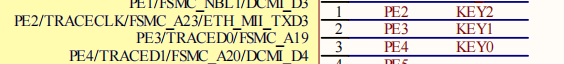 由按键的原理图可以看出,WK_UP按键对应PA0,按下后为高电平,松开为低电平。KEY_0按键对应PE4,按下后为低电平,松开为高电平。