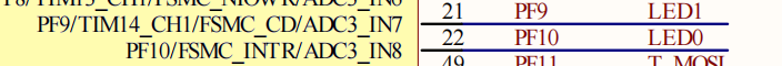 如图所示:LED0-->PF10,LED1-->PF9