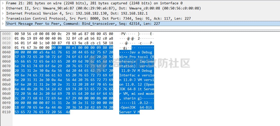 同样前4个字节表示Reply Packet数据包的长度,这里为000000e3,转换成十进制为227,减去包头的11个字节,数据部分就有216个字节,包头部分中Flags为0x80表示当前是Reply Packet数据包,Error Code为0表示命令正确执行,剩下216个字节就是数据部分,返回的是目标JVM实现的JDWP版本信息以及JVM版本信息