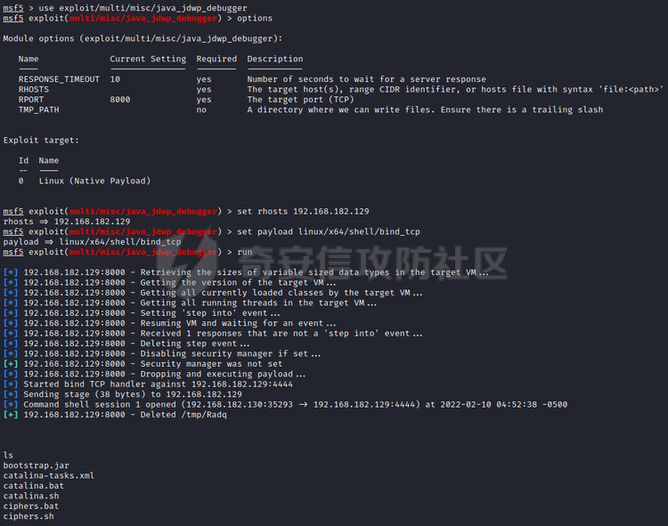 还可以使用Metasploit自带的漏洞利用模块exploit/multi/misc/java_jdwp_debugger进行漏洞利用