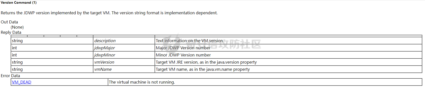 在这个整个数据包中Data段就是JDWP数据包内容,前4个字节用来表示JDWP数据包的长度,这里为0000000b转换成十进制就是11,也就是说当前整个JDWP数据包的长度为11个字节,说明这个JDWP数据包只有包头部分。接下来4个字节为Id标识符,这里为00000009。再接下来1个字节为Flags,这里为0,表示当前是一个Command Packet,也就是说最后2个字节分别是Command Set和Command,这里都为1,表示向被调试JVM端获取目标JVM实现的JDWP版本信息。