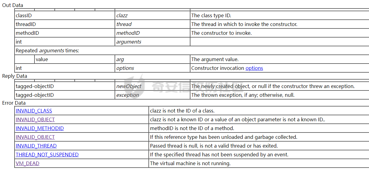 下一步是实现得到一个InputStreamReader实例化对象,可以通过向被调试JVM端发送(ClassType, NewInstance)命令调用类的指定构造方法来创建实例化对象,创建InputStreamReader对象要传入InputStreamReader类的refTypeId和指定构造方法的methodId