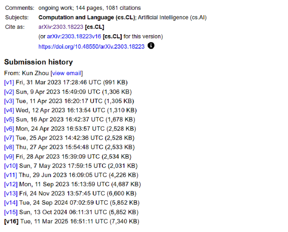 在国内,中国人民大学的科研团队于2023年3月底发布A Survey of Large Language Models论文,全面综述了大模型界的最新研究成果,此后,这篇综述持续更新,截至2025年3月,已有整整16个版本,最新一版文章达144页,引用了1000余篇论文。