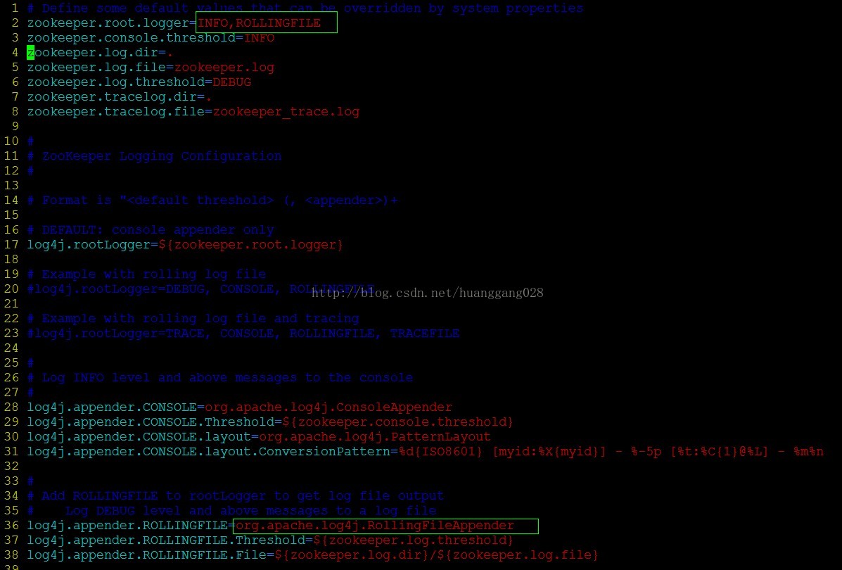 2、修改$ZOOKEEPER_HOME/conf/log4j.properties文件的:zookeeper.root.logger的值与前一个文件的ZOO_LOG4J_PROP 保持一致,该日志配置是以日志文件大小轮转的,如果想要按照天轮转,可以修改为DaliyRollingFileAppender.