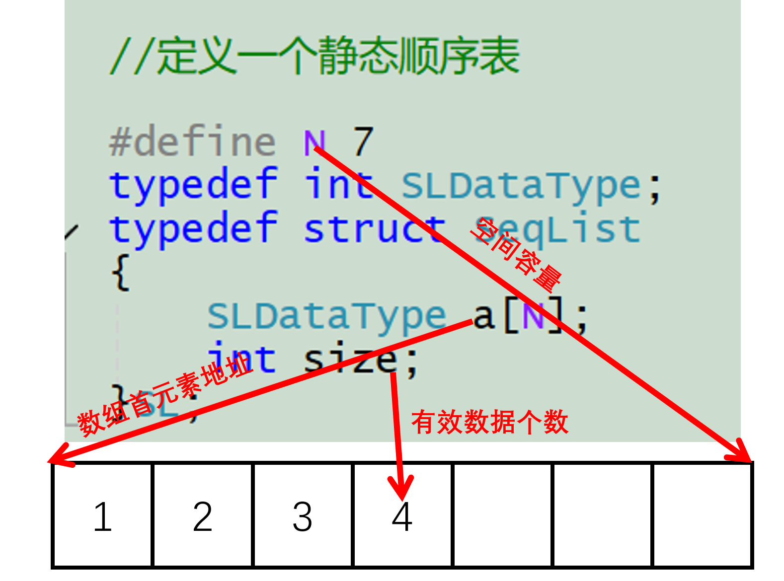 当我们使用静态顺序表的时候,初始数组中肯定是没有数据的,当我们往里面插入数据的时候,数组中的有效数据才会增长,接着数据插着插着肯定会有插满的时候,什么时候插满呢?这就要根据我们的空间容量来判断。通过上面的分析,我们可以知道要创建一个静态顺序表需要一个定长的数组a[N],因为是定长数组,所以最大容量就是N,知道有效数据个数size,这就要求我们使用一个结构将这3个信息存放在一起,这就会用到我们的结构体struct。