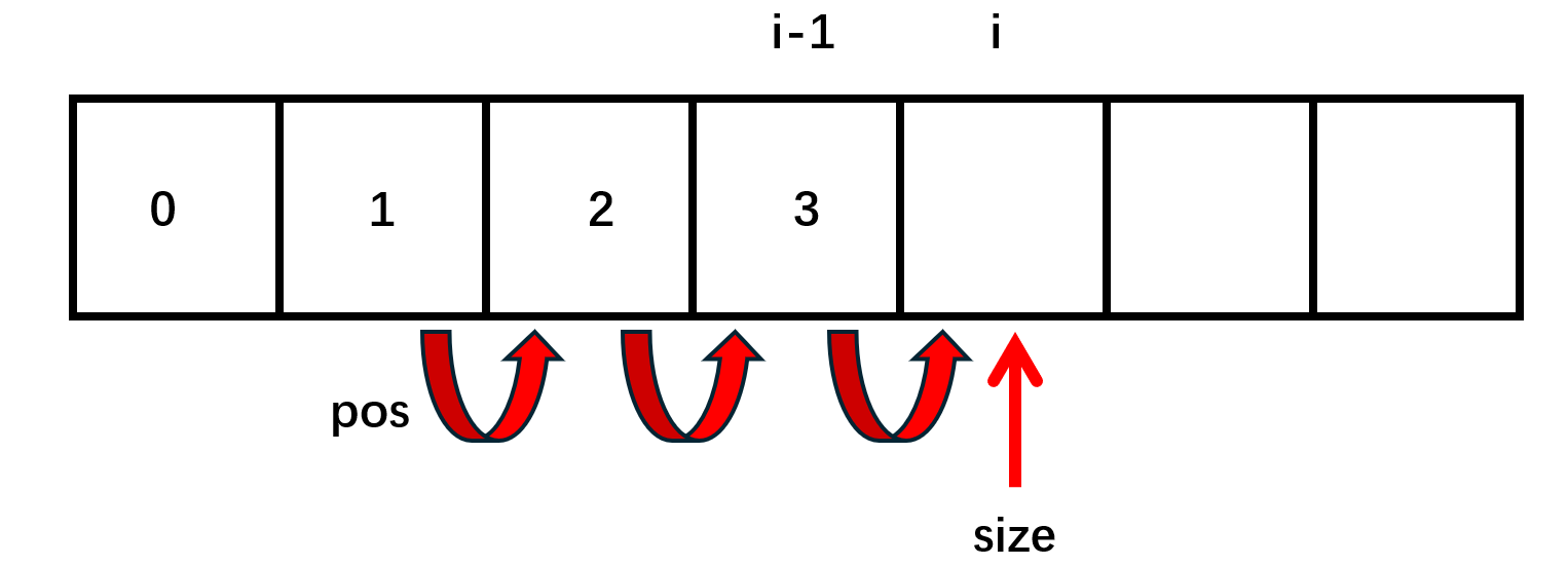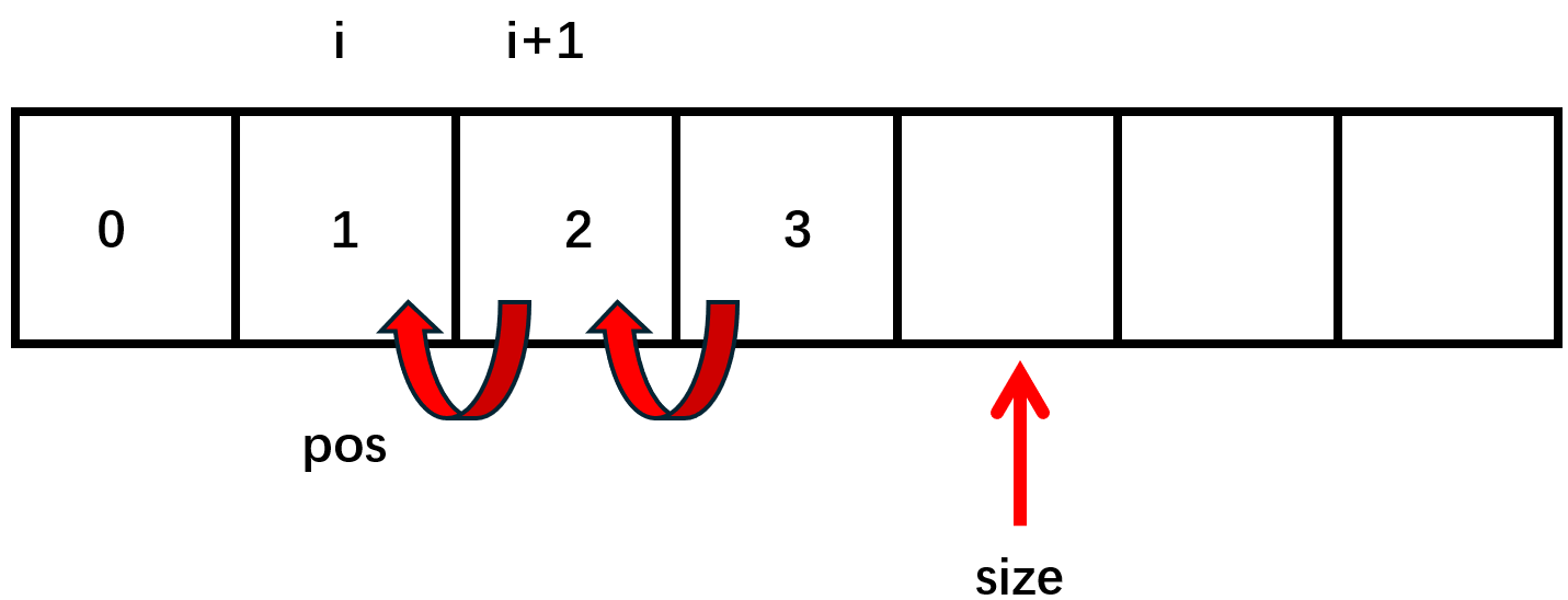 我们想要删除数据1,pos存储了数据1的下标,我们初始时将 i 等于pos,依次将 i+1 的值赋给i,接着i++,当 i 等于size-1时,挑出循环。
