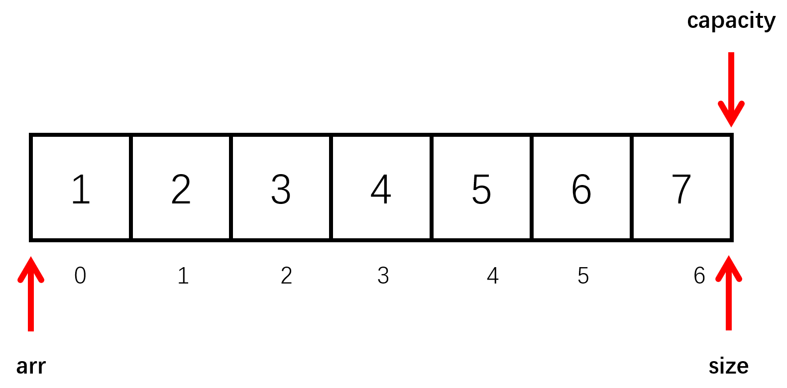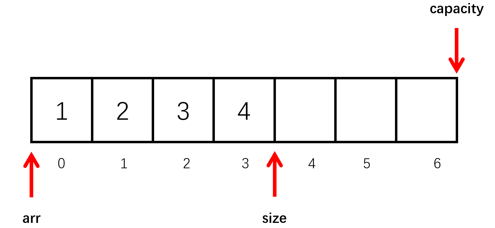 图中已经存放了4个有效数据,所以size就等于4,这时候插入数据只需要向arr数组中下标为size的位置插入,接着size++就行。