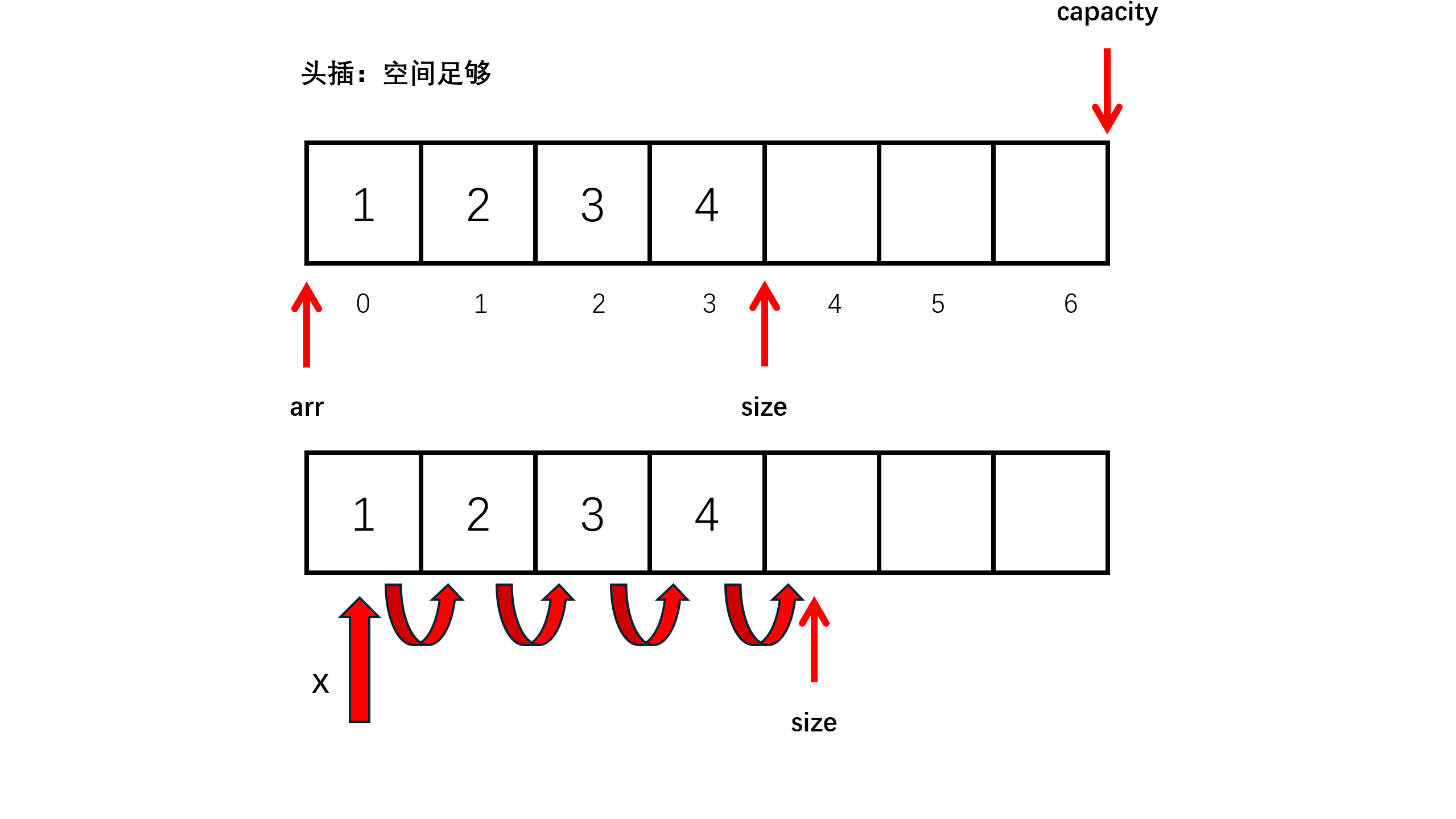 当空间容量足够的时候,我们可以让现有的数据整体向后移动一位,即最后一个数据移动到下标为size的位置,之前的数据依次向后移动,最后size++,这样第一位即下标为0的这一位就空了出来,用于插入新的数据。