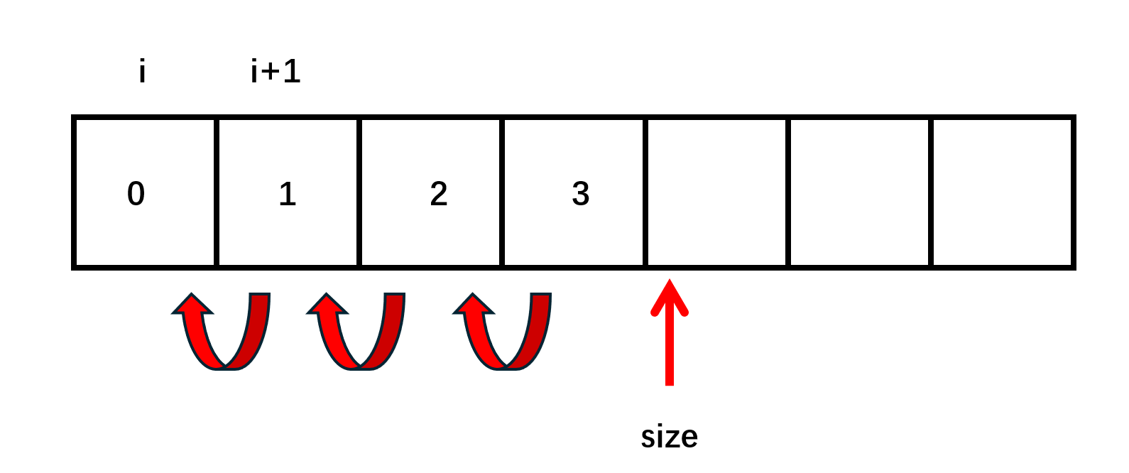 我们让 i 初始值为数组下标为0的位置,然后依次将 i+1 的值赋值给 i ,当i = size - 1时就停止赋值,最后size--。