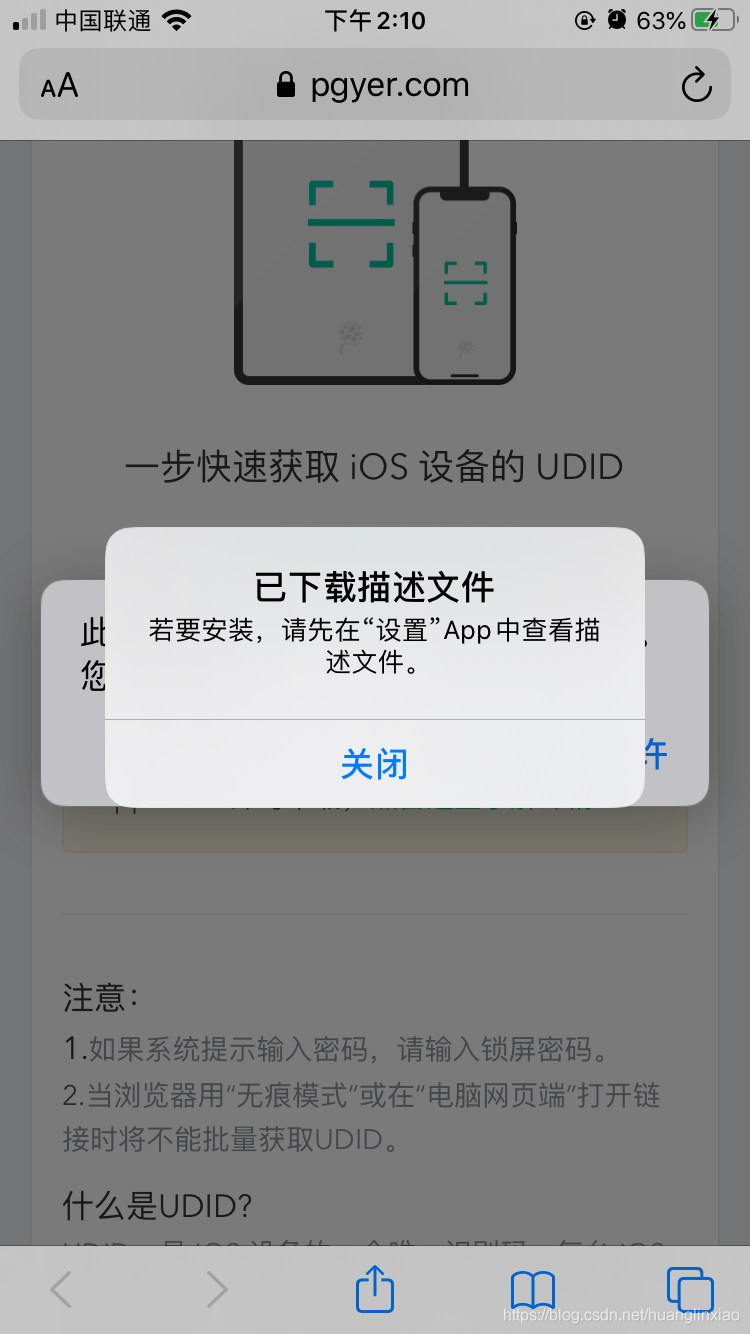 注:如果已经安装过此文件,会提示已下载描述文件,点击 关闭,再此点击“允许” 即可。
