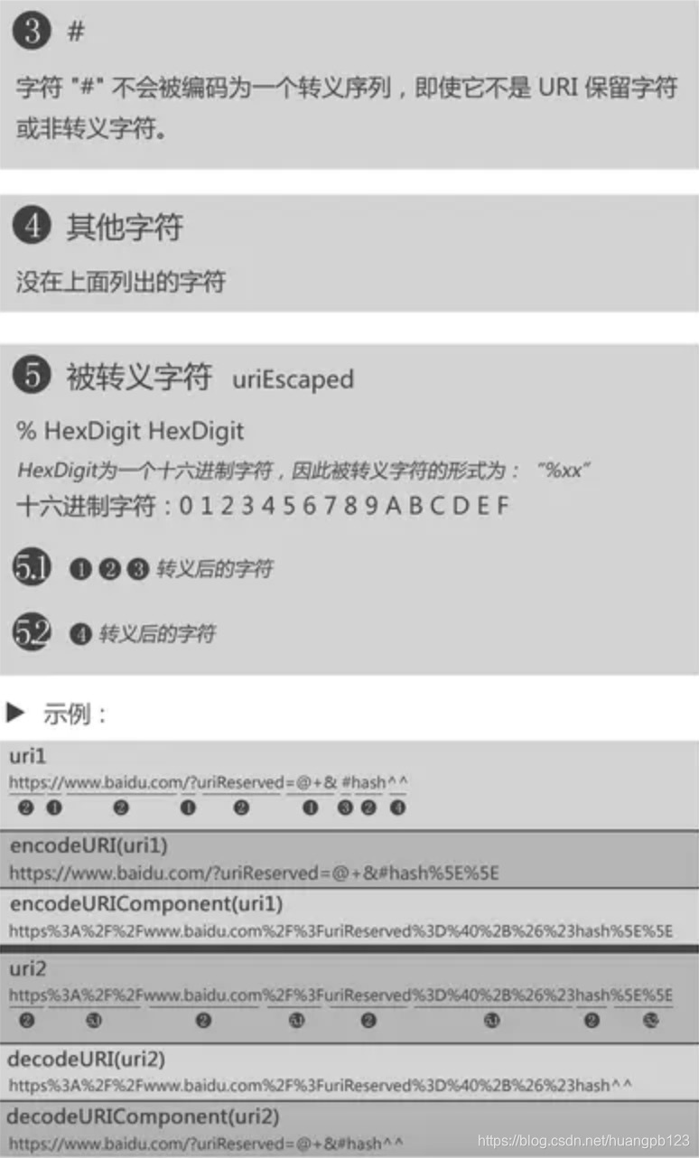 encodeURIComponent 和 decodeURIComponent 函数操作的是组成 URI 的个别组件;这俩函数假定任何保留字符都代表普通文本,所以必须编码它们,所以它们(保留字符)出现在一个完整 URI 的组件里面时不会被解释成保留字符了。