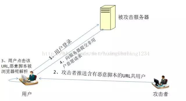 常见的XSS攻击类型有两种,一种是反射型,攻击者诱使用户点击一个嵌入恶意脚本的链接,达到攻击的目的,如下图所示:
