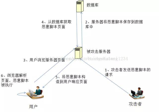 另一种XSS攻击是持久型XSS攻击,黑客提交含有恶意脚本的请求,保存在被攻击的Web站点的数据库中,用户浏览网页时,恶意脚本被包含在正常页面中,达到攻击的目的,如下图所示: