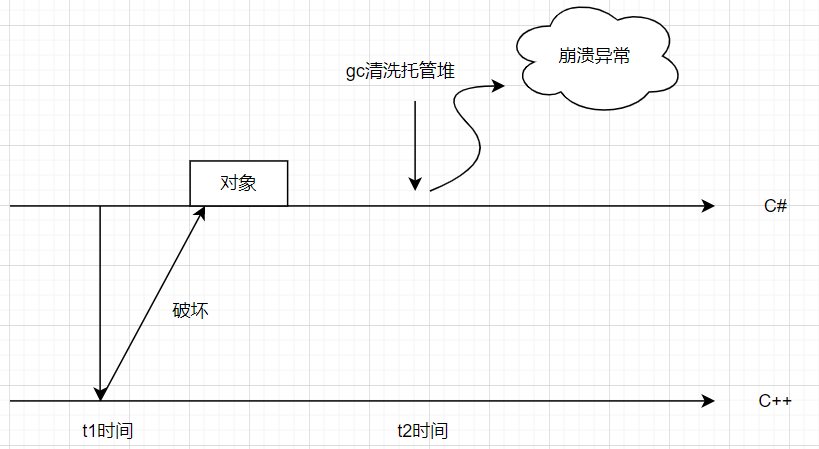 交互时产生的,在后续的某个时候 GC 在清洗托管堆时才发现家里被偷继而报警,但此时已经错过了第一时间,画个图大概是这样。