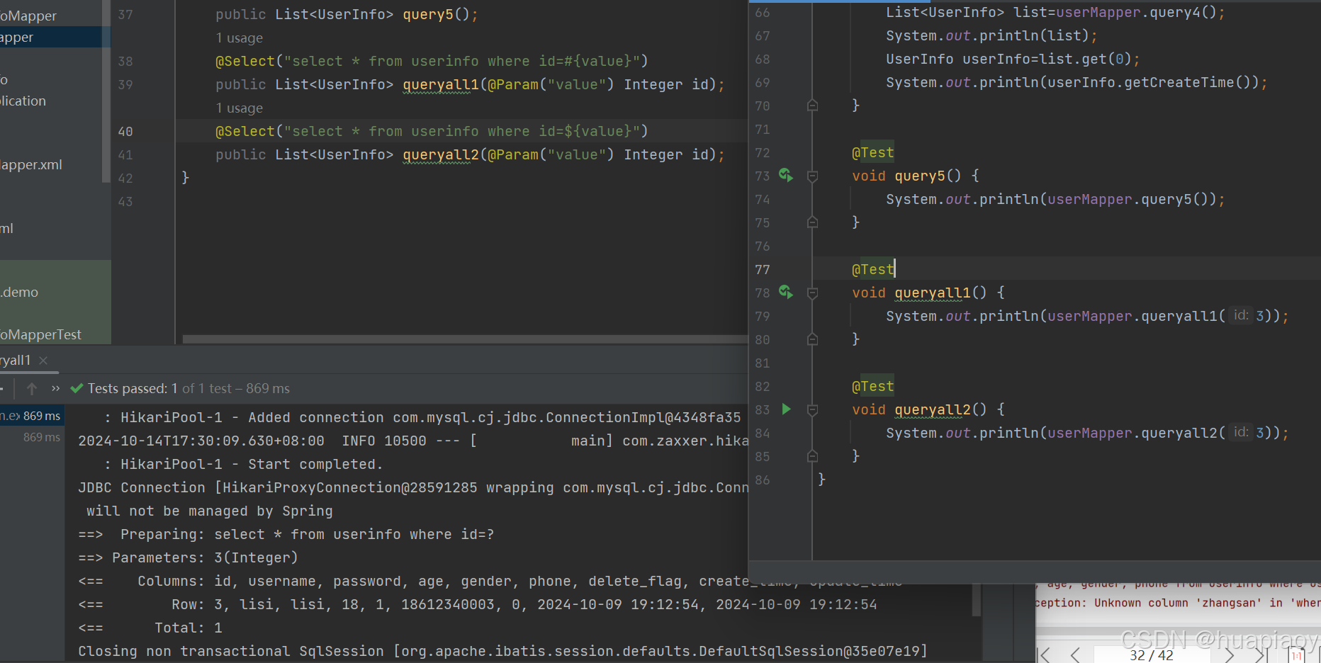 Mybatis补充和标签的使用 mybatis中参数赋值有两种方式,我们之前都是使用#{}来进行赋值,那这两种方式肯定也是有区别的,接下来我们就来看看两者间的区别首先我们来看一下使用#{}来赋值一个intrger类型的参数我们发现我们的sql请求是有一个?去占位的,然后我们传的参数给到这个问号占的位置,这种sql我们称为预编译sql那我们使用${}再来看一下我们发现sql请求没有?,而是直接id=3,也就是参数直接拼接在sql语句中了接下来我们看一下传String类型使用#{}来赋值依然没有问题。