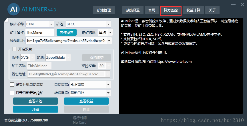 在之前的版本中,用户只能获取显卡的算力,最大温度和最小温度,但是并不知道每张显卡的具体情况。AIMiner4.3版本添加了显卡显示功能。用户只要在运行软件的同时,点击软件上方的“算力监控”按钮,就能够查看每张显卡的算力,温度,功耗,风扇转速等详细信息。右面还会根据当前算力,显示预期收益。需要强调的是:该处显示的功耗是显卡内部核心的功耗,不包含电损,实际功耗会比展示的功耗略高一些。如下图所示: