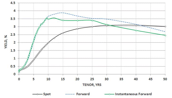 4. 最后上一张图,给点Instantaneous Forward Rate 和 Spot Rate的关系(图里面的Forward也没标,先不看他)。