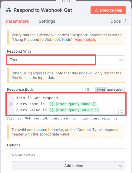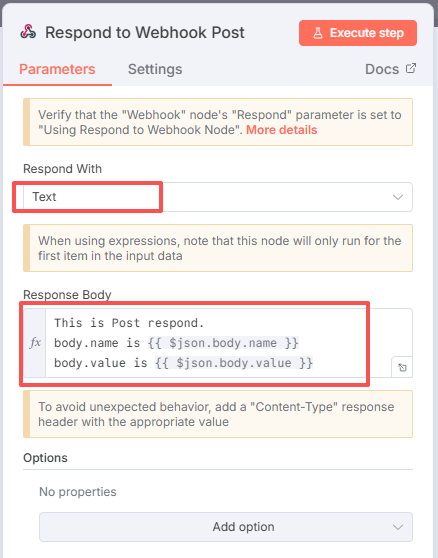 Using ‘Respond to Webhook’ Node: 按照响应Webhook节点的数据返回。
