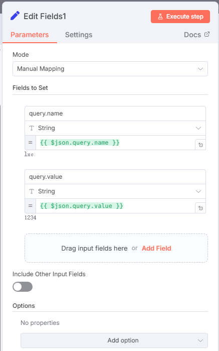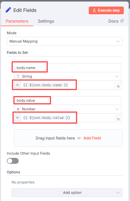 Set节点参数如下,把 Webhook发来请求参数保存下来: