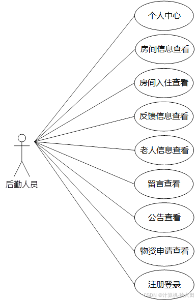 图3.6即为后勤人员用例图,后勤人员权限操作的功能包括查看房间,查看房间入住的老人,查看反馈信息,查看物资申请信息等。