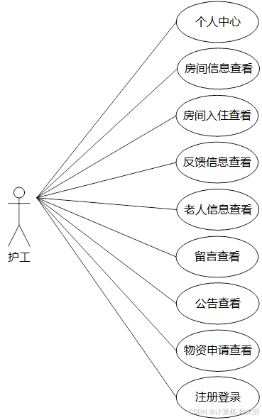 图3.7即为护工用例图,护工权限操作的功能包括查看老人信息,查看反馈信息,查看留言信息,查看公告等。