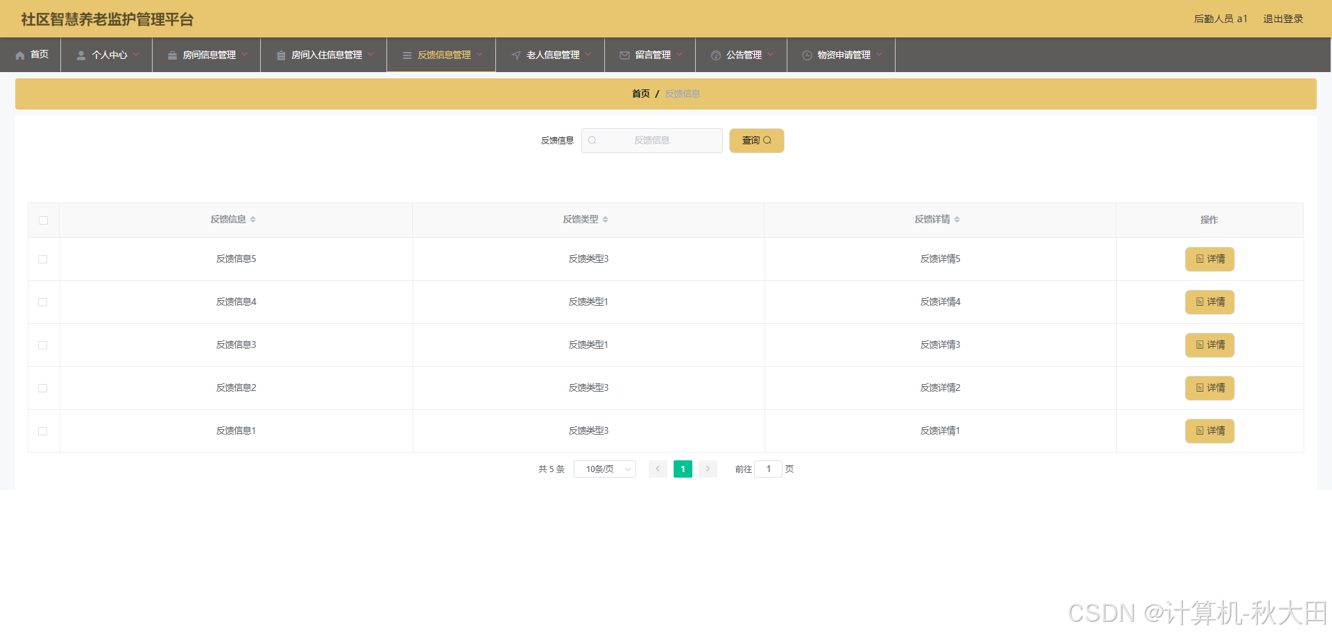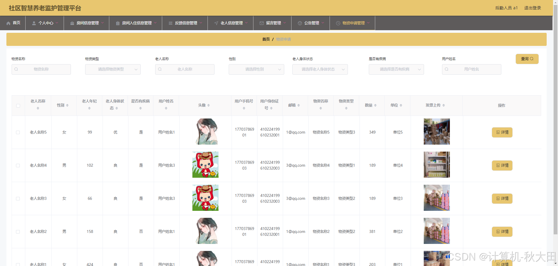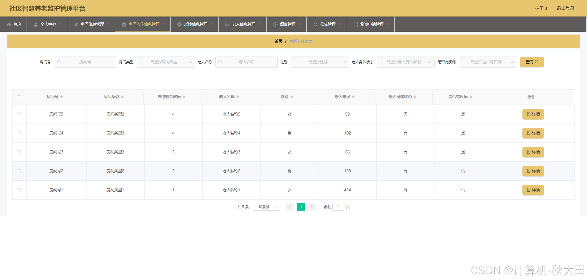 社区智慧养老监护管理平台能够实现反馈信息管理,房间入住管理,老人信息管理,留言管理,物资申请管理,体检员管理,后勤人员管理,护工管理,房间管理等功能。该系统采用了Mysql数据库,Java语言,Spring Boot框架等技术进行编程实现。