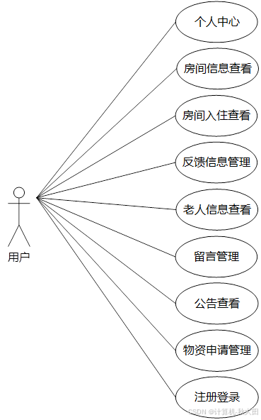 图3.9即为用户用例图,用户权限操作的功能包括管理留言,管理反馈信息,管理物资申请信息,查看老人信息等。