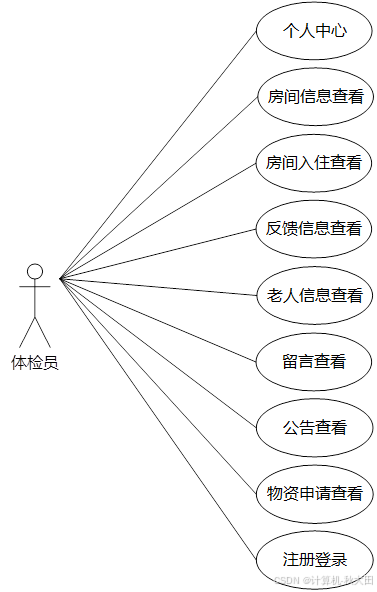 图3.8即为体检员用例图,体检员权限操作的功能包括查看物资申请信息,查看老人信息,查看房间入住信息等。