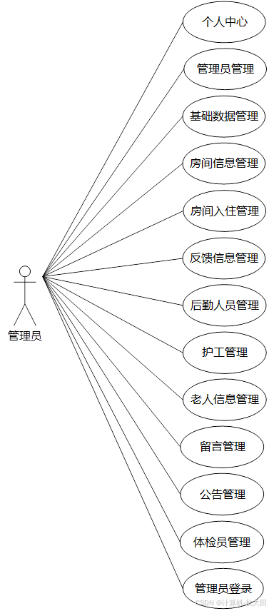 图3.5即为管理员用例图,管理员权限操作的功能包括对后勤人员,体检员,护工,老人,房间信息,房间入住信息,反馈信息以及留言等信息的管理。