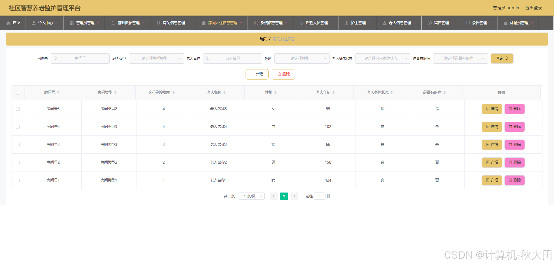 图5.2 即为编码实现的房间入住管理界面,管理员在该界面中为老人入住房间的信息进行新增,查询,编辑,删除等。