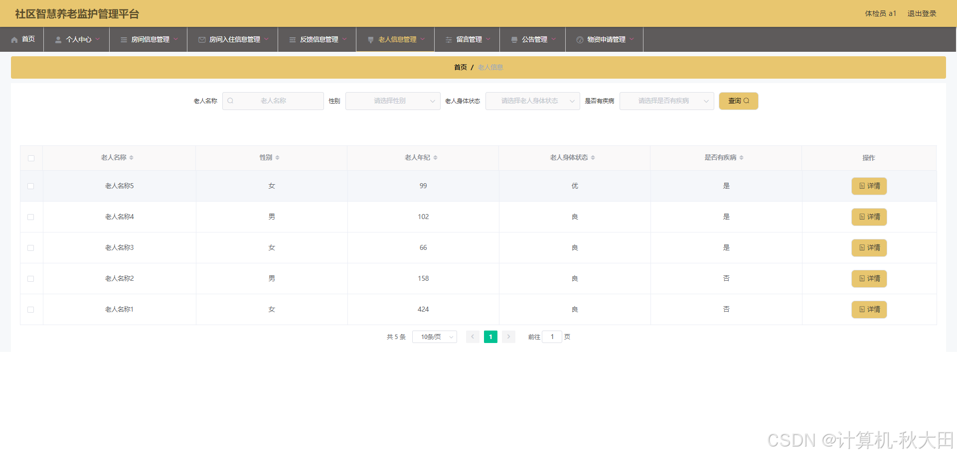 图5.8 即为编码实现的老人信息查看界面,体检员在该界面中查询老人信息,对老人信息进行查看,包括老人身体状态,是否有疾病等。