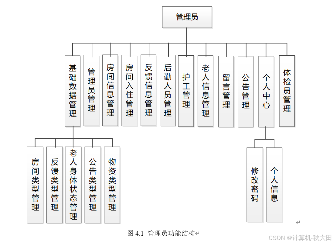 图4.1即为设计的管理员功能结构,管理员权限操作的功能包括对后勤人员,体检员,护