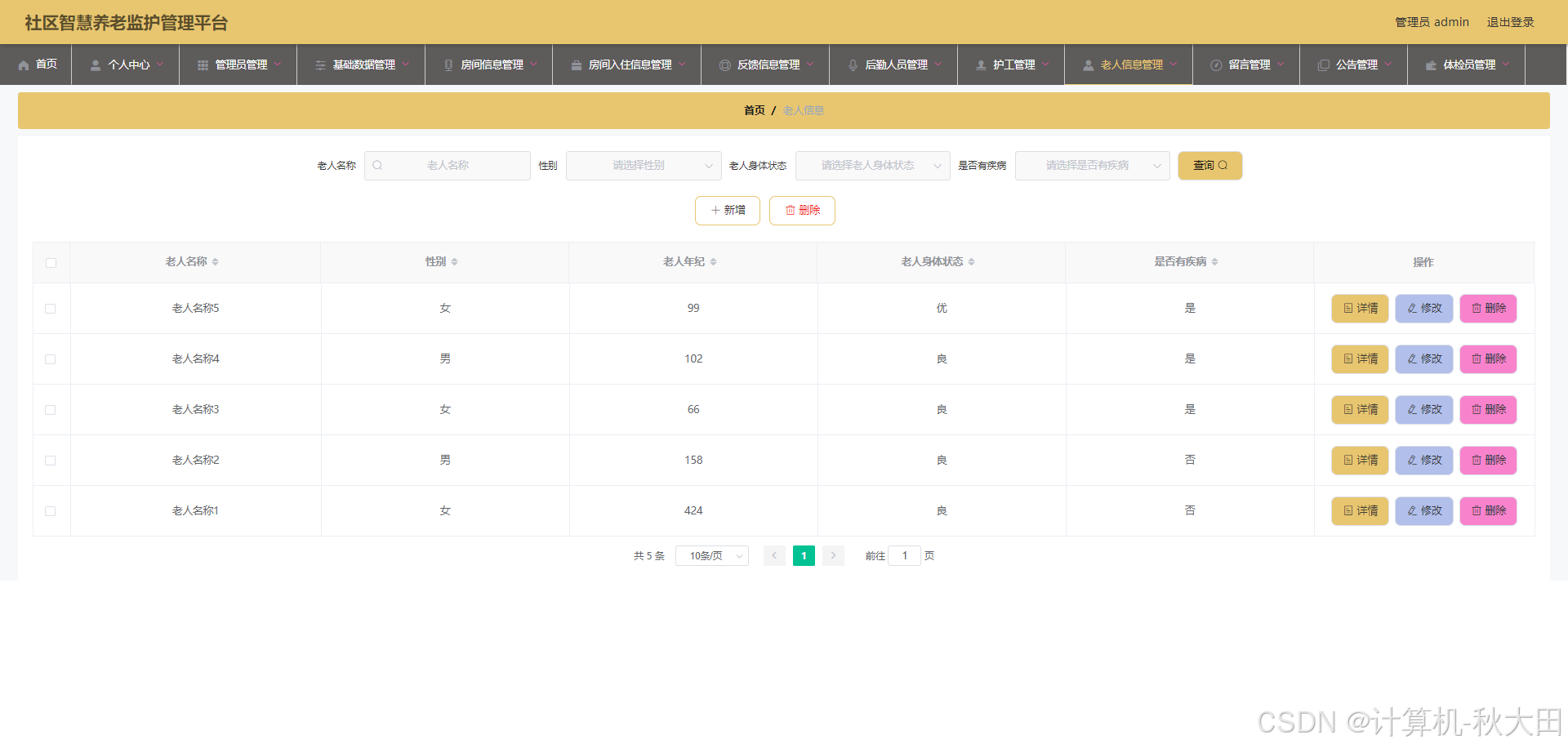 图5.3 即为编码实现的老人信息管理界面,管理员在该界面中对老人的信息进行新增,包括老人身体状态,老人年纪等信息,可以修改老人信息,查询老人信息等。