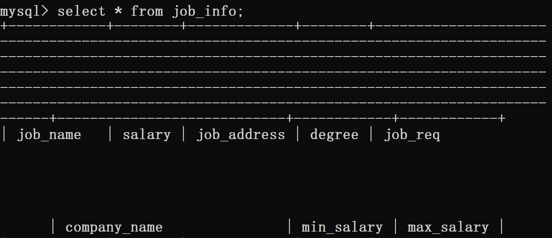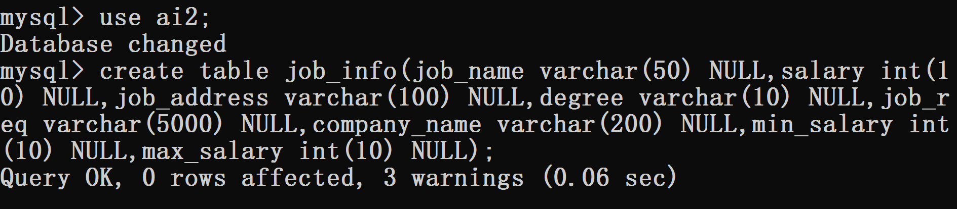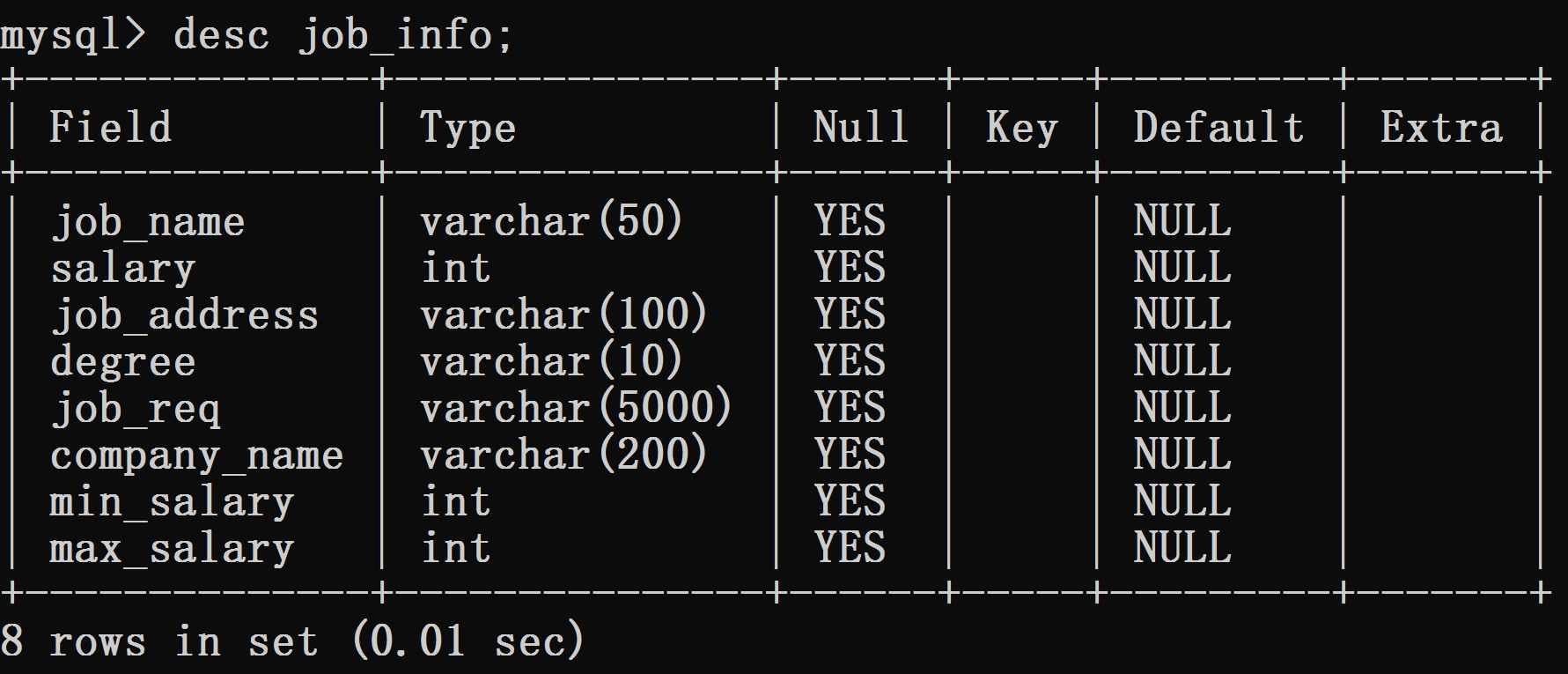 Create table job_info(job_name varchar(50) NULL,salary int(10) NULL,job_address varchar(100) NULL,degree varchar(10) NULL,job_req varchar(5000) NULL,company_name varchar(200) NULL,min_salary int(10) NULL,max_salary int(10) NULL);