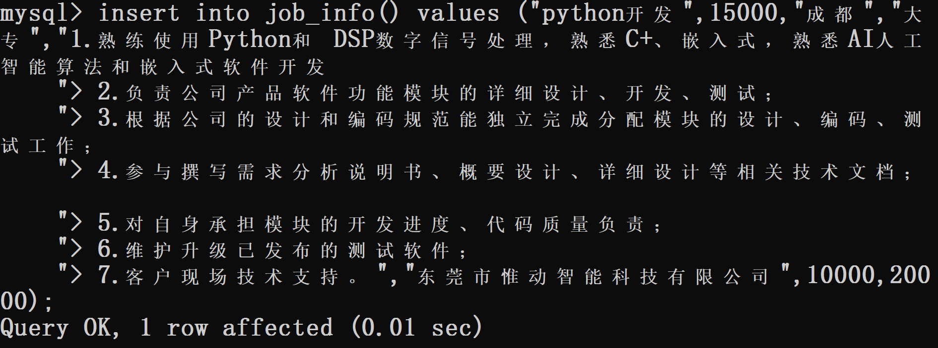 insert into job_info() values (“python开发”,15000,”成都”,”大专”,”1.熟练使用Python和 DSP数字信号处理,熟悉C+、嵌入式,熟悉AI人工智能算法和嵌入式软件开发2.负责公司产品软件功能模块的详细设计、开发、测试;3.根据公司的设计和编码规范能独立完成分配模块的设计、编码、测试工作;4.参与撰写需求分析说明书、概要设计、详细设计等相关技术文档;5.对自身承担模块的开发进度、代码质量负责;6.维护升级已发布的测试软件;7.客户现场技术支持。”,”东莞市惟动智能科技有限公司”,10000,20000);