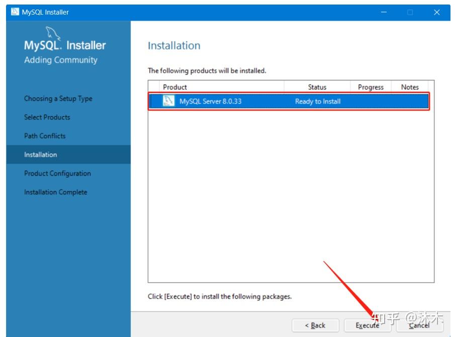 环境配置好了,就可以安装MySQL了。点击选中“MySOL Server 8.0.33”,然后点击“Execute”执行安装。