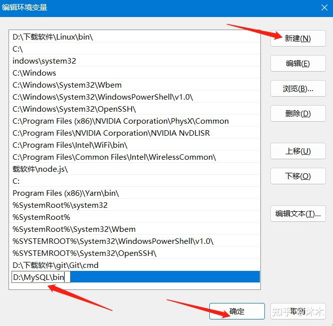 - 复制好MySQL安装路径,点击“新建”,将MySQL安装路径添加上去,点击“确认”