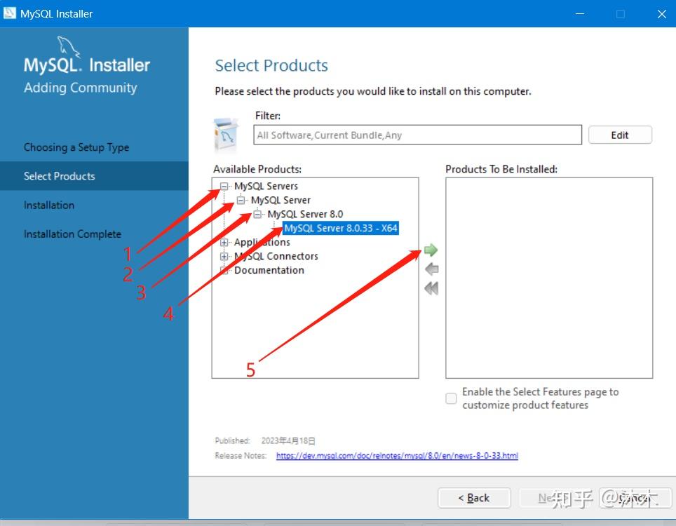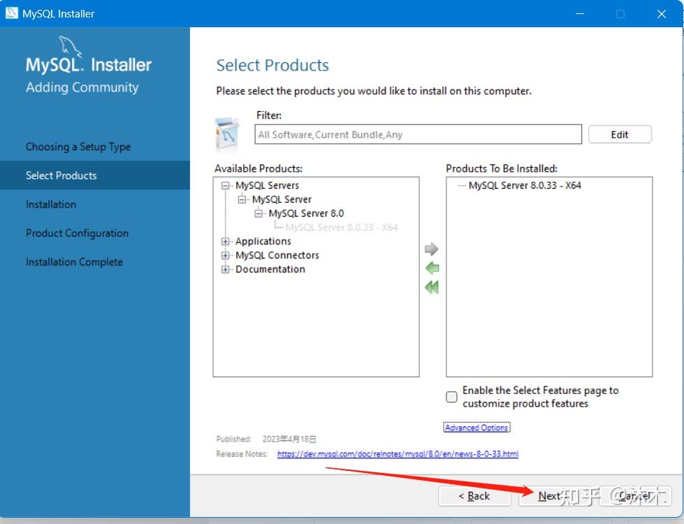 依次点击 "MySQL Servers" -> "MySQL Server" -> "MySQL Server 8.0" -> "MySQL Server 8.0.33 - X64",最后点击“绿色的箭头”,将选中的版本移植到右边的框中