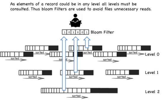 即使有每个文件的索引,随着文件个数增多,读操作仍然很慢。通过周期的合并文件,来保持文件的个数,因些读操作的性能在可接收的范围内。即便有了合并操作,读操作仍然会访问大量的文件,大部分的实现通过布隆过滤器来避免大量的读文件操作,布隆过滤器是一种高效的方法来判断一个sstable中是否包含一个特定的key。(如果bloom说一个key不存在,就一定不存在,而当bloom说一个文件存在是,可能是不存在的,只是通过概率来保证)