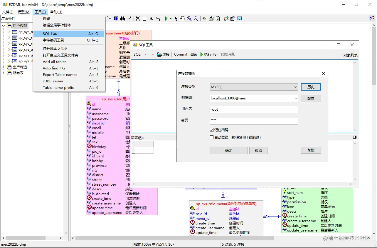 EZDML的SQL数据查询功能介绍 EZDML自带了一个SQL查询工具,当然它比较简单,不能代替我们常用的开发工具,但在救急时也能当个临时工,同时它跟模型结合来做一些数据查询操作也非常方便。接下来我们以之前导入过的MES模型为例简单介绍一下