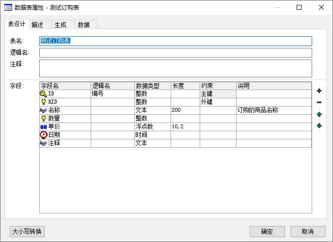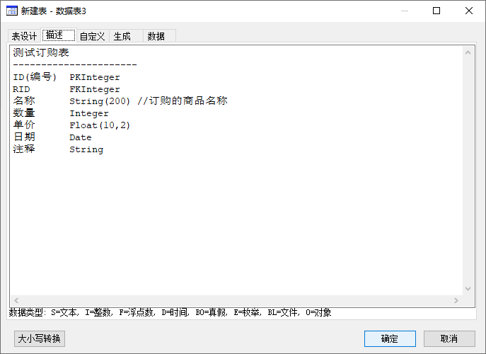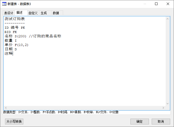 描述字编辑功能是本软件的一大特色,即可以用直接用键盘输入快速完成建表。之所以有这个功能,是我觉得建一个表不需要用鼠标点那么多下中间还键盘输入那么麻烦,直接文本编辑是最快的。有了这个功能后方便多了,基本上我建表时也再不去用那个常规界面了。而且用这个来复制粘贴表结构也很方便。