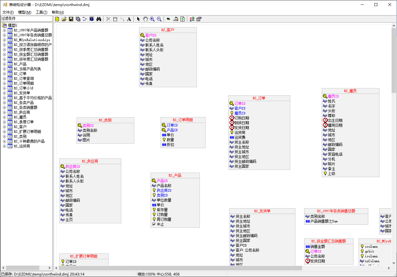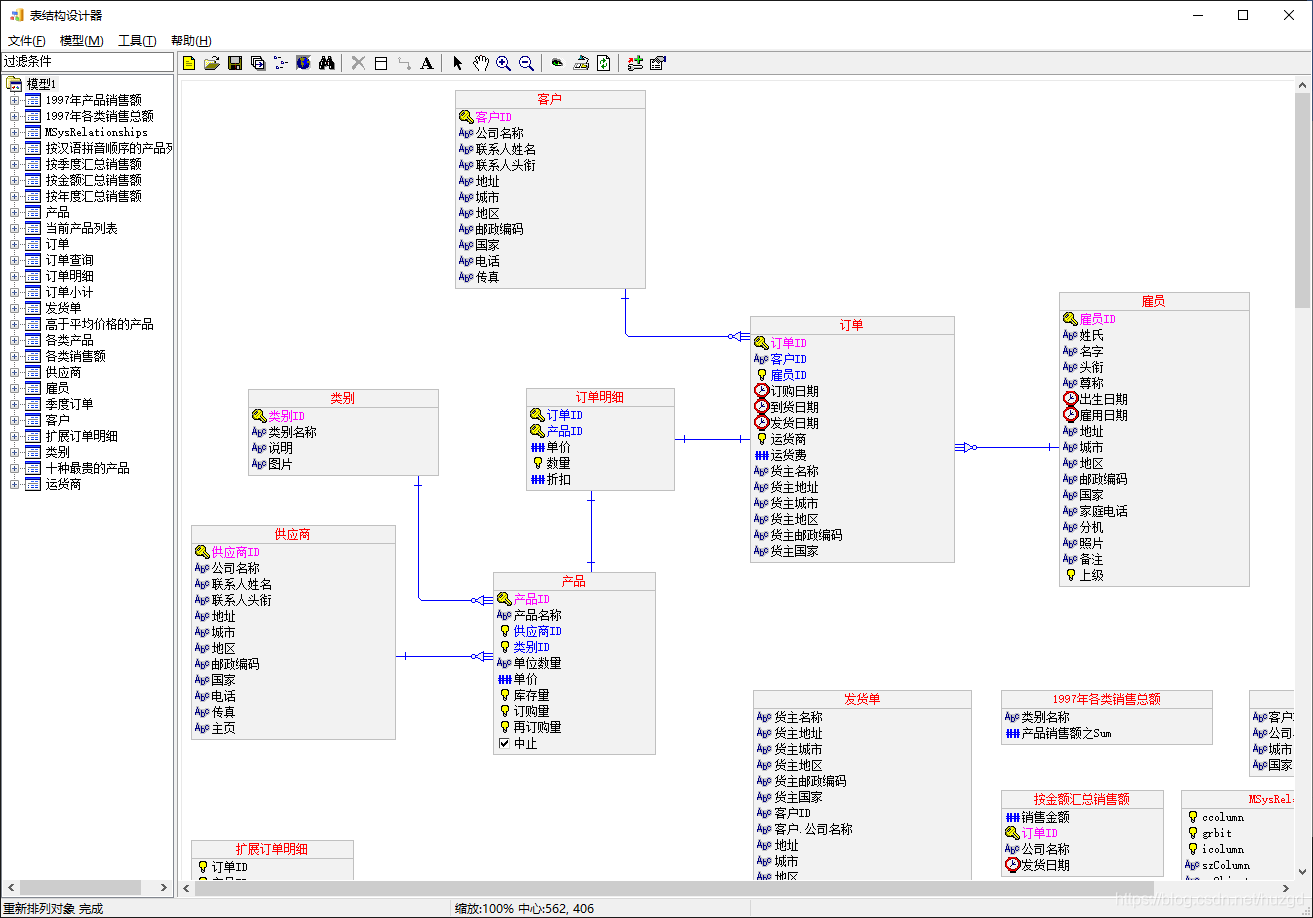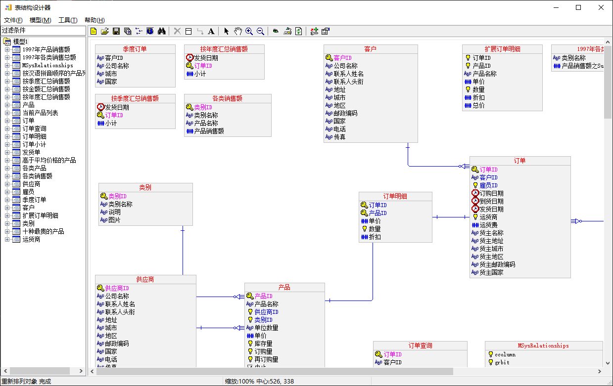 即常说的逆向工程了。这里以Microsoft Access附带的“罗斯文商贸”数据库为例(这玩意应该是以前的Access自带的,现在已经找不到了,装了个OFFICE2000才弄到):