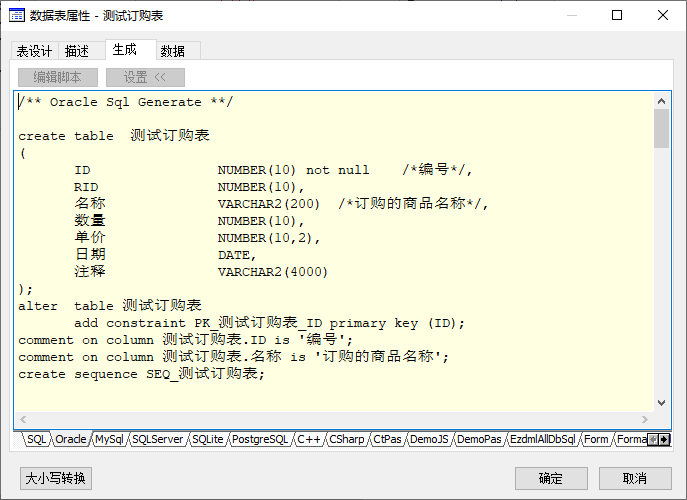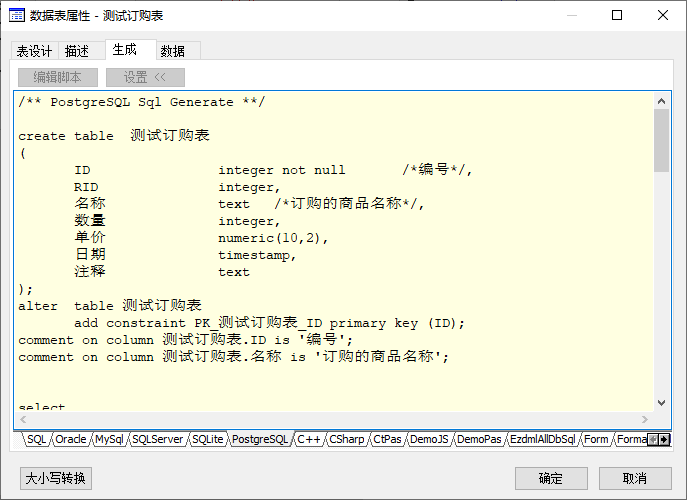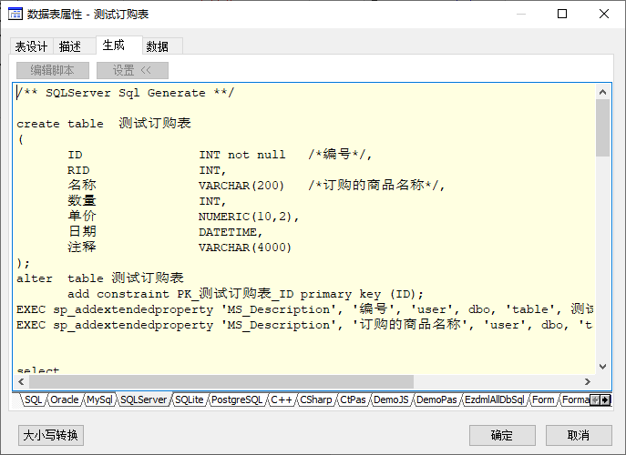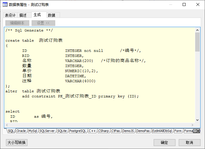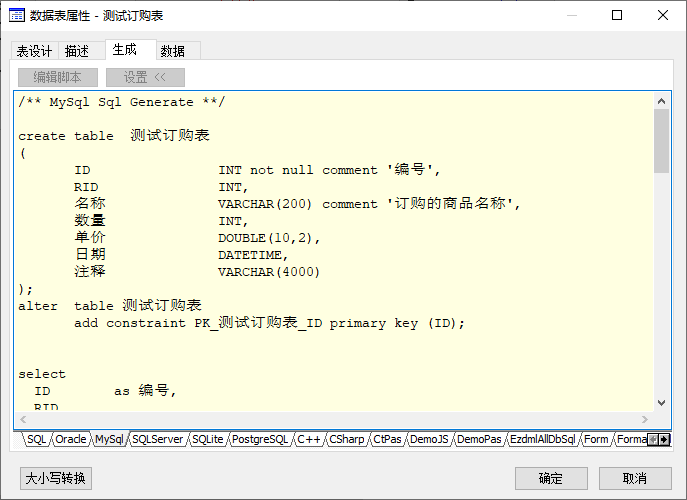 在表的属性窗口中,切换到“生成”页,可生成多种代码,包括:
