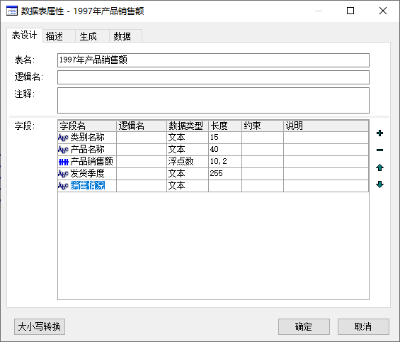 为了说明生成功能,我们先找第一个表修改一下,增加文本字段“销售情况”,并把“产品销售额”由“浮点(19)”改为“浮点(10,2)”: