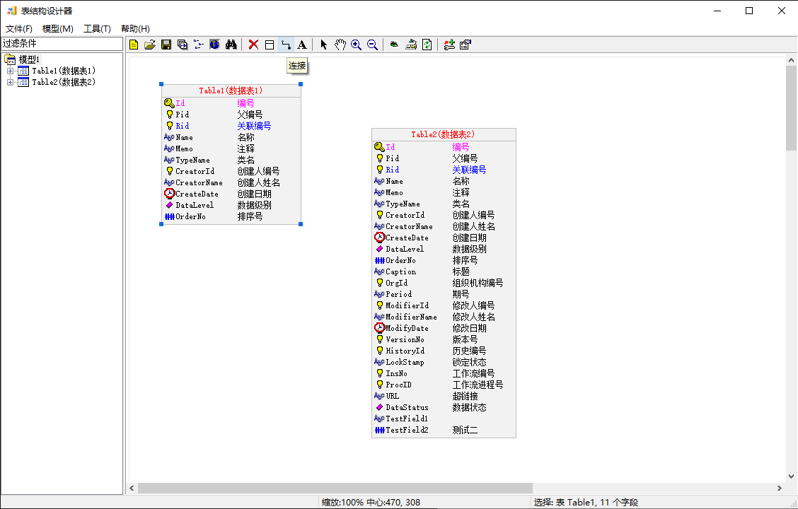 接着,在模型图上选中“数据表1”,再点工具栏上的“连接”: