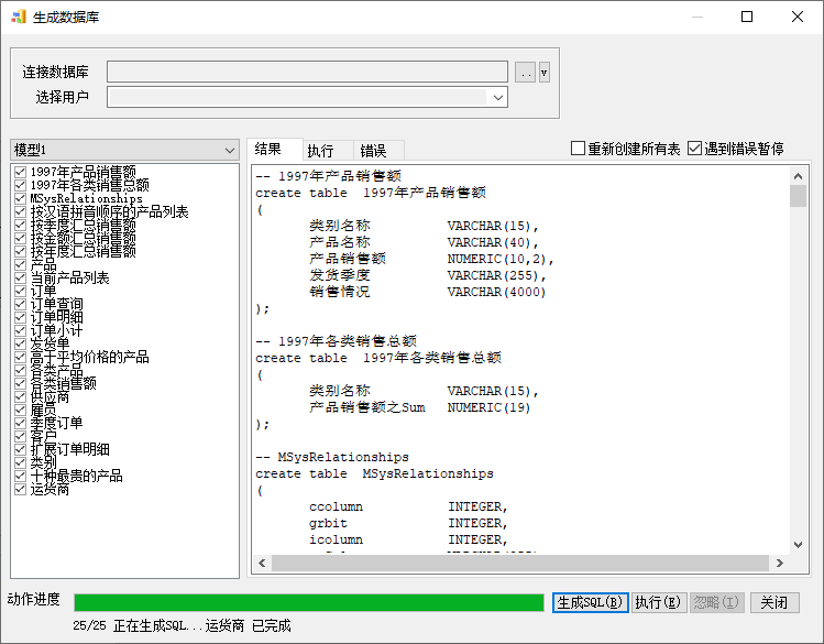 执行“模型|生成数据库”菜单命令,系统显示生成数据库界面: